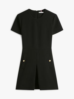 This shift dress features top-stitched panels, darts and a front box pleat to bring a flattering fit-and-flare silhouette to the mini-length design.