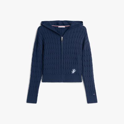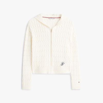 The all-over cable knit and hooded neckline add to the cosiness of this zip-thru layer, complete with intricate script logo embroidery.