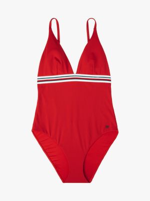 Dit badpak met een lage halslijn en diepe rug heeft een elegante look door de iconische signature-strepen.