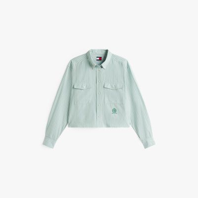Upgrade je dagelijkse look met dit college-inspired overhemd van puur katoen met een relaxed fit en een modern cropped silhouet.