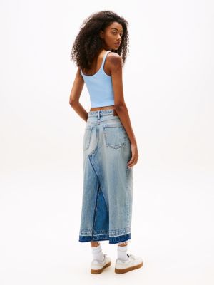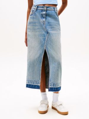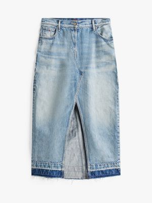 Boost je zomergarderobe met deze moderne midi-rok van denim met een rechte pasvorm en een onafgewerkte overdyed zoom.
