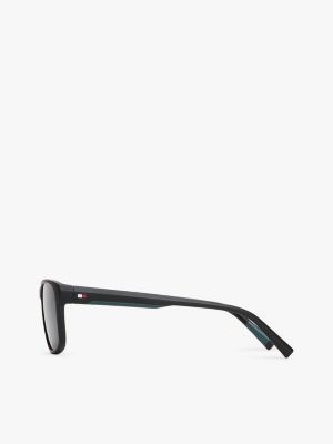 Deze zonnebril met gestroomlijnde rechthoekige glazen heeft flexibele scharnieren en rubberen uiteinden voor een betere grip.